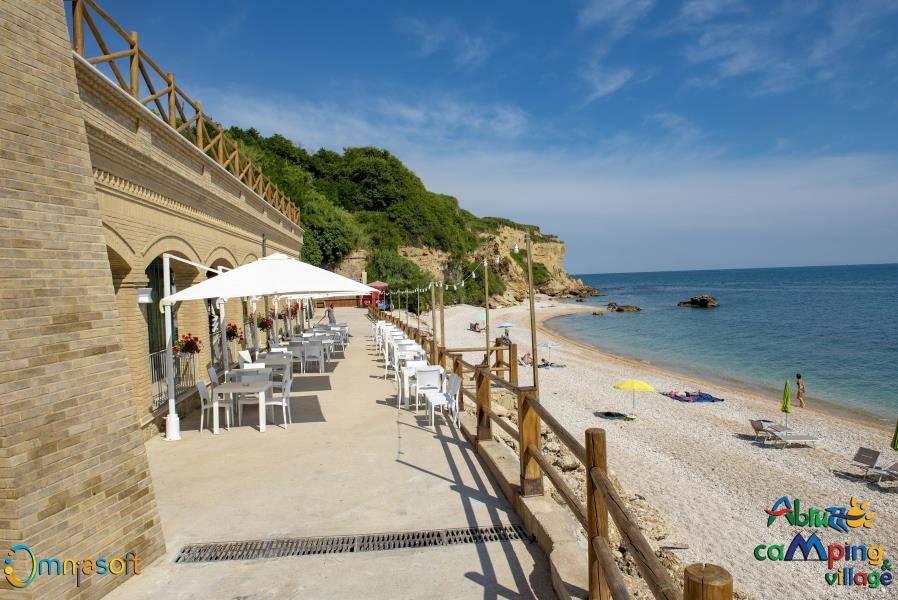 An enchanted bay, a natural amphitheatre on the sea, breathtaking views such as the Aragonese castle and the skyline of Ortona visible from the camping area, fiery sunrises over the sea to be admired from the comfort of your bungalow, a swimming pool with hydromassage suspended between sky and sea overlooking the bay. In our splendid restaurant, resting on the natural rock in view, you can savour traditional Abruzzo dishes such as the not-to-be-missed 'brodetto' or a tantalizing 'frittura di paranza' (fried fish) while indulging in a candlelit dinner with the sound of the waves crashing on the shoreline.